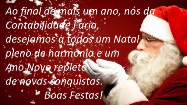 "Ao final de mais um ano, nós da Contabilidade Faria, desejamos a todos um Natal pleno de harmonia e um ano novo repleto de novas conquistas.
